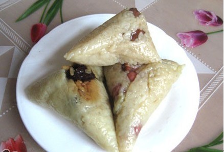 做法:將糯米泡一夜,然后把花生米、豇豆泡6小時以上,五花肉切塊加醬油、姜、料酒、糖和鹽漿一夜。把粽葉泡軟,取一片粽 葉折出一個三角,放一勺米,再放豆、花生米、肉和棗,最后再放一勺米。用手壓實米,把粽葉從上往下折疊,疊成三角形,用 棉線綁結(jié)實。在高壓鍋放進沒過粽子的水,上面壓一個盛水的盆,蓋好鍋蓋,扣限壓閥燒開一個半小時即可。