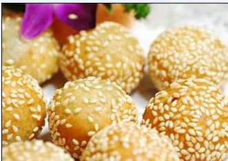 做法:將糯米粉150克用清水和成粉團,放人沸水中煮熟,然后加入350克生糯米粉、100克白糖揉成面團 作為為皮料。將紅糖、白糖加適量清水煮熬成糖膠液,再加入爆谷花、花生仁和芝麻仁拌勻成餡,并趁熱按成小團。然后取皮面 55克,包入餡料750克,搓成圓形,灑上一層水后,粘上一層芝麻,即成煎堆生坯。最后鍋內(nèi)加植物油燒至六七成熱,放入生坯, 炸至膨起呈圓形至熟即可。