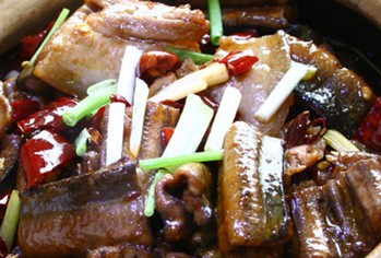 砂鍋鱔魚的做法:先將冬菇浸軟去腳、燒腩切塊,蒜肉用將滾之油炸黃撈起,把鱔魚洗凈抹水斬塊,加 腌料腌二十分鐘。然后將鱔魚沾滿生粉用滾油大火炸黃撈起,約二分鐘后重炸至金黃色撈起。再將生菜洗凈,切短段放在煲仔內(nèi) 。[美食中國]在鍋內(nèi)放油一湯匙,爆香姜、蒜,放冬菇和酒半湯匙,加入調(diào)味煮滾,把燒肉和鱔魚兜均勻,倒落在己放有生菜之 煲內(nèi),最后加蓋大火煮滾,放蔥和加油二湯匙即可。