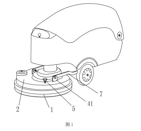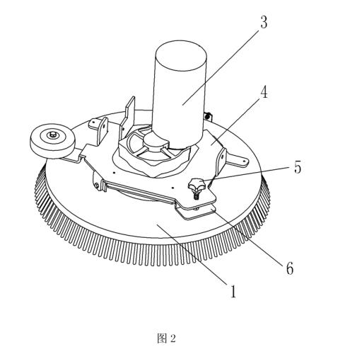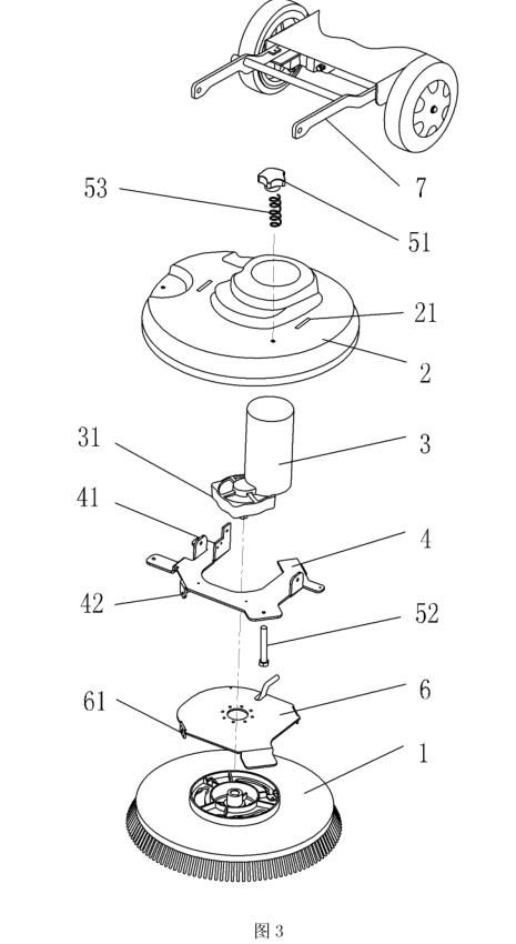 有益效果是:本實(shí)用新型在使用過(guò)程中,當(dāng)調(diào)節(jié)螺栓向下運(yùn)動(dòng)吋,電機(jī)固定板受カ繞鉸接軸轉(zhuǎn)動(dòng),產(chǎn)生偏擺,也帶動(dòng)刷盤(pán)組件向一側(cè)偏擺,從而増大了刷盤(pán)毛單側(cè)對(duì)地面的壓力,進(jìn)而在刷盤(pán)旋轉(zhuǎn)過(guò)程中形成了一定的牽引力,使刷盤(pán)轉(zhuǎn)動(dòng)更加輕松,減輕了操作者的疲勞強(qiáng)度;同時(shí),可根據(jù)地面條件的不同,對(duì)調(diào)節(jié)螺栓的旋入程度進(jìn)行調(diào)整,即調(diào)整對(duì)電機(jī)固定板的壓カ大小,從而改變刷盤(pán)毛單側(cè)對(duì)地面的壓力,以實(shí)現(xiàn)不同地面條件下?tīng)恳Υ笮〉倪m度調(diào)整。
